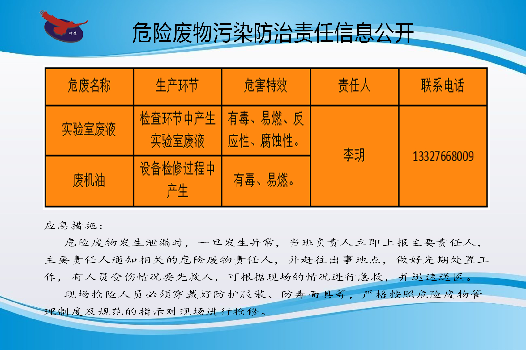 危險廢物發(fā)生泄漏時,一旦發(fā)生異常,當班負責人立即上報主要責任人主要責任人通知相關(guān)的危險廢物責任人,并趕往出事地點,做好先期處置工作,有人員受傷情況要先救人,可根據(jù)現(xiàn)場的情況進行急救,并迅速送醫(yī)現(xiàn)場搶險人員必須穿戴好防護服裝、防毒面具等,嚴格按照危險廢物管理制度及規(guī)范的指示對現(xiàn)場進行搶修。